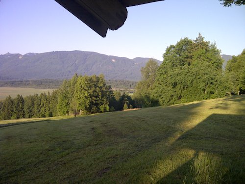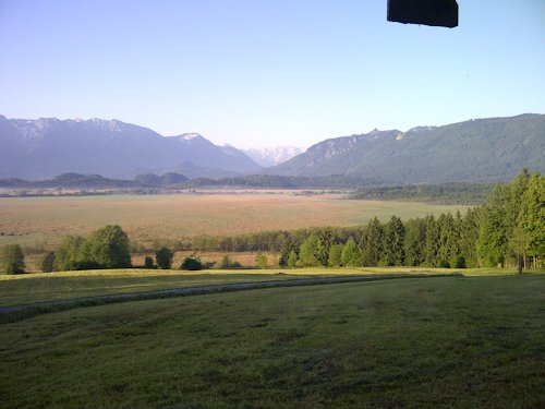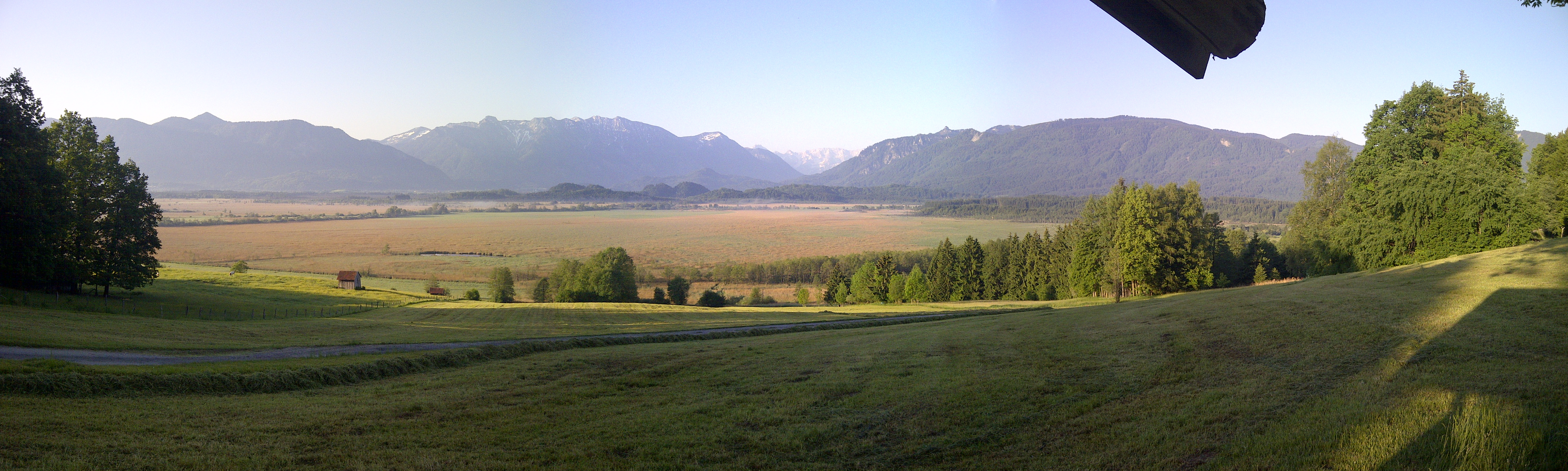 26. Mai, in den Morgenstunden. Der Schatten rechts stammt von einem meiner Lieblingsplätze auf der Strecke zwischen Westried und Berggeist, der sogenannten Panoramahütte. Sie heißt für mich nicht nur wegen des grandiosen Ausblicks so, sondern weil man vor ihr eine Panoramatafel aufgestellt hat, mich Erläuterungen zum Murnauer Moos und einem Panoramafoto mit den Namen der Berge und besonders herausragender landschaftlicher Merkmale. In den Morgenstunden bei einem solchen Wetter ist dies möglicherweise einer der schönsten Orte der Welt.