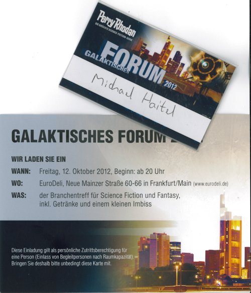 Dieses Jahr wurde mir ein Wunsch erfüllt: Ich durfte mit auf das »Galaktische Forum« des Pabel-Moewig Verlags in Frankfurt, traditionall am Freitagabend der Buchmesse veranstaltet. Der Auslöser war nicht so erfreulich: jemand war krank geworden (und die ganze Geschichte dazu behalte ich für mich). Gefreut habe ich mich trotzdem. Es gab eine bestens aufgelegte … oder besser aufgedrehte Uschi Z., einen lange nicht gesehenen Udo K., einen erstmals kennengelernten Stefan P., und Autoren wie Thomas F., Marc A. H. u.v.a.m. Und für mich das Gefühl, zwar ein Verleger zu sein, aber halt doch nur eine kleine Nummer.
