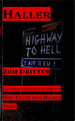 Das Lesevergnügen war unzweifelhaft da. Das waren knapp zwei Stunden, die sich gelohnt haben. Dennoch gibt es beim dritten HALLER dann etwas zu kritisieren. Und zwar Grundsätzliches. Das Umschlaglayout ist, was seine »Unhübschheit« angeht, im Grunde in Ordnung. Man kann sich sicherlich auch streiten, was ein »Highway to Hell«-Straßenschild (Frontcover) und eine Landstraße (Backcover) mit dem Thema »Stadt« zu tun haben; vielleicht auch nicht, denn beide führen möglicherweise genau dort hin. Aber nicht mehr akzeptabel finde ich es, wenn auf dem Rückumschlag schwarze Schrift auf fast schwarze Flächen gesetzt wird, sodass man sie allenfalls entziffert, wenn man das Büchlein kippelnd gegen das Licht hält. Auch würde ich an der Stelle der Herausgeberin beginnen, über eine Layoutänderung im Inneren nachzudenken – denn auf Dauer wirkt die rund anderthalbzeilige Textanordnung seitenschinderisch, und ein stinknormaler 120%-Durchschuss würde auch dem HALLER nicht schaden, wahrscheinlich im Gegenteil den Preis von inzwischen 5 Euro mit einem erkennbaren [!] Gegenwert versehen. Und ich kann mir nicht vorstellen, dass die Griesbacherin sich über mangelnden Zulauf beklagen kann.