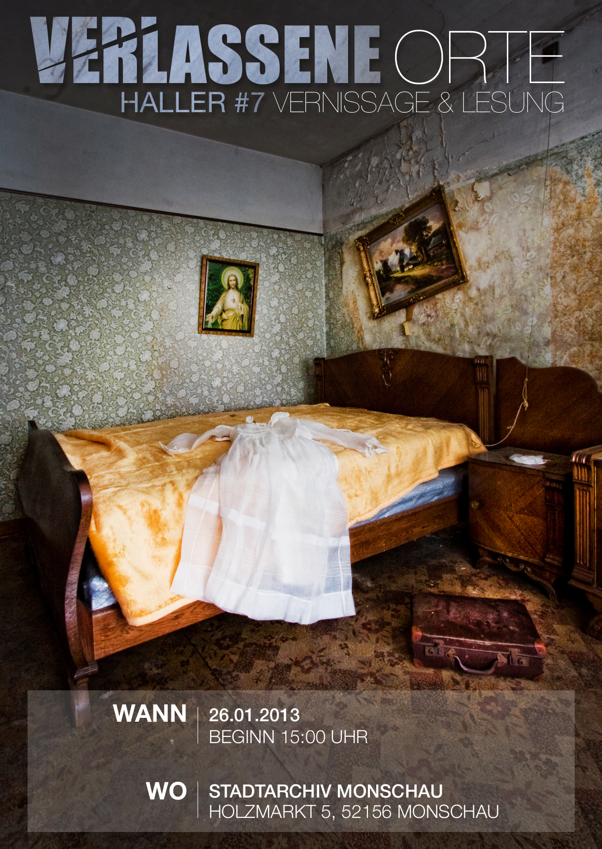 Sebastian Schwarz, der die Fotos zum HALLER 7 und dem Taschenbuch »VERLASSENE ORTE« gemacht hat, veranstaltet am 26.01.2013 ab 15 Uhr eine Vernissage im Stadtarchiv Mnschau (Holzmarkt 5, 52156 Monschau, 5 Minuten vom Parkhaus Seidenfabrik und der Bushaltestelle Monschau-Parkhaus entfernt). Danach gibt es eine Lesung aus der Literaturzeitschrift HALLER 7 »Verlassene Orte«. Mit dabei sind nach heutigem Stand neben Sebastian Schwarz auch die Autoren Ruth Möbius-Hanssen, Axel Bölling, Salina Petra Thomas, Sabine Frambach, eventuell auch Markus Cremer.