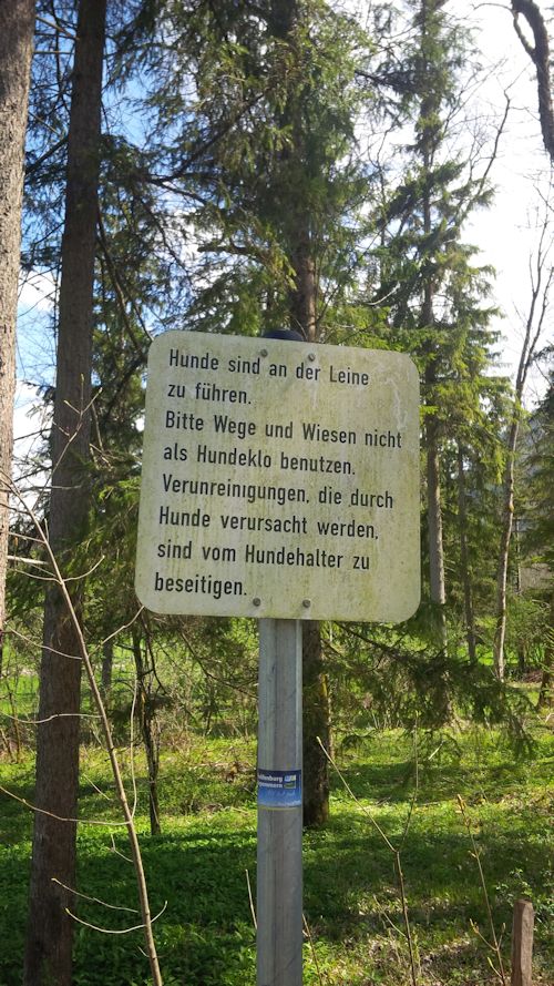 auf dem Rückweg in der anderen Richtung. Jeweils davor und zwischen beiden Schildern findet man mitunter die erbaulichen Portionen dünnschissiger Gäule. Was man nirgendwo findet – weder im Ort Ohlstadt auf der Heubergstraße, die den Anfang des Eschenloher Fußweges ausmacht, noch auf dem ganzen Weg bis Eschenlohe –, das ist ein Abfallbehälter, in den man den »Hundekot sofort beseitigen und entsorgen« könnte. Für die beschissenen Schilder war das Geld da – für die Behälter nicht mehr (*). (Und für die Ausbildung des Intellekts der Beteiligten gab es wohl von vornherein keine finanziellen Mittel: Anderenfalls wäre vielleicht mal irgendjemand auf die Idee gekommen, dass man sich Schilder sparen kann, wenn man einfach einen Behälter mit einem Sackerlspender aufstellt. Dass das funktioniert, beweisen die Obrigen in Seehausen am Staffelsee, über die ich immer gerne lästere, weil sie das Testgelände für Verbotsschilderhersteller in Deutschland sind, aber in Bezug auf Konsequenz müssen sich die Seehausener jedenfalls keinen Vorwurf gefallen lassen.)