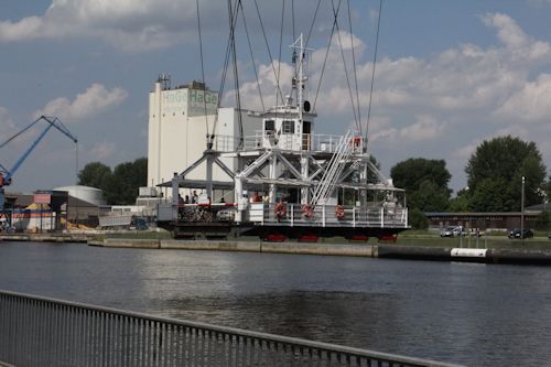 P.S.: Ein Wort noch zu der Schiffsbegrüßungsanlage, an der Hochbrücke mit Schwebefähre. Es handelt sich dabei um ein Café, durchaus gut besucht, in dem jedes vorbeifahrende Schiff vorgestellt wird – wie es heißt, was für ein Schiff es ist, woher, wohin usw. usf. Gleichzeitig wird beim Vorbeifahren die Nationalhymne des Landes gespielt, unter dessen Flagge das Schiff fährt (was dazu führt, dass dieser Ort wohl derjenige in Deutschland ist, wo am häufigsten karibische und asiatische Nationalhymnen zum Besten gegeben werden). Die Schiffe, die vorbeifahren, grüßen mit Signalen zurück, und zwar, wie mir schien, immer mit dem gleichen: lang, kurz, kurz, kurz, lang. – Nette Idee. Aber wir haben uns nicht dort niedergelassen, denn für unsere Hunde gab’s kein Wasser.