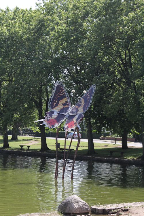Nachdem wir die Einkäufe im Auto verstaut hatten und uns einen Ortsplan von Heide besorgt hatten, gönnten wir uns im Restaurant Carpe Diem in der Rosengasse ein Mittagessen. Die Rosengasse ist eine richtige Gasse, keine zwei Meter breit, hinten in einen kleinen Innenhof auslaufen. Rechts, wenn man reinkommt, ist eine Kneipe, links das Restaurant. Wir bekamen – wiederum dank zweier netter Einheimischer – einen Platz, der später dank Markise auch schattig wurde. Und ich bekam endlich meinen Fisch, einen Pannfisch, das waren drei Fischfilets mit Bratkartoffeln und Remoulade. Lecker, reichlich.