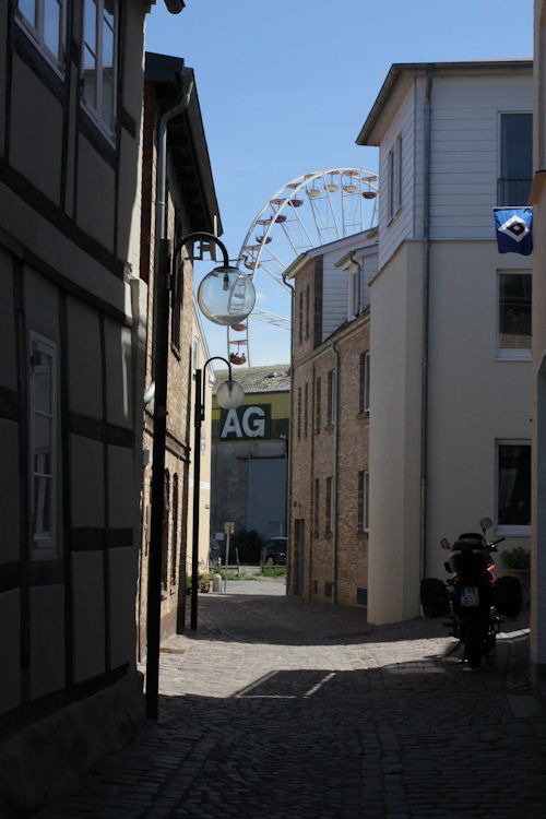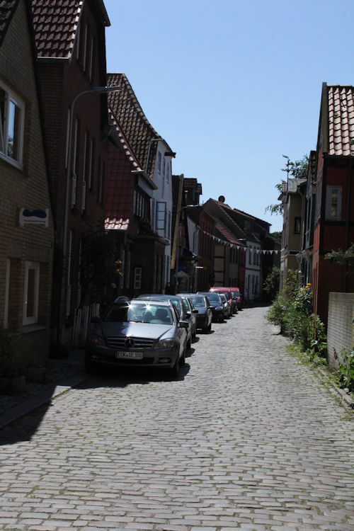 Negativ ist mir auch einmal mehr aufgefallen, wie ungünstig sich Inkonsequenz bei der Gestaltung von Fußgängerzonen auswirken kann. Die Fußgängerzone von Eckernförde – wozu auch die Altstadt gehört – ist eine von diesen halbherzigen Fußgängerzonen, zu denen an zahlreichen Stellen Kraftfahrzeuge Zugang haben. In den eigentlichen Einkaufsstraßen zum Beispiel der Lieferverkehr im Grunde immer, bis auf drei Stunden (10 bis 13 Uhr). Und in den Altstadtstraßen die Anwohner. Ich finde das vor allem unter optischen Gesichtspunkten nicht schön. Wenn man hübsche Straßen wie in der Eckernförder Altstadt, mit hübschen alten Häusern, mit Rosensträuchern vor den Gebäuden ordentlich fotografieren möchte, dann stören die herumstehenden Blechhaufen einfach den Gesamteindruck.