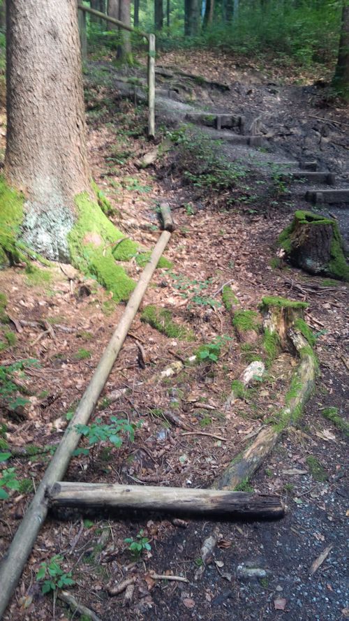 Um den Aufstieg auf der Südseite zu erleichtern, hat man eine Art Treppe angelegt. Die einfache Variante: quer eingesetzte Holzbretter, geschotterte Erde aufgeschüttet, passt, sitzt, wackelt, hat Luft, wie man hier sagt. Auf der (von unten gesehen) linken Seite gibt es einen Handlauf, auf der rechten Seite eine »Spur« für Pferde, Mountainbiker und andere Radlfahrer.
