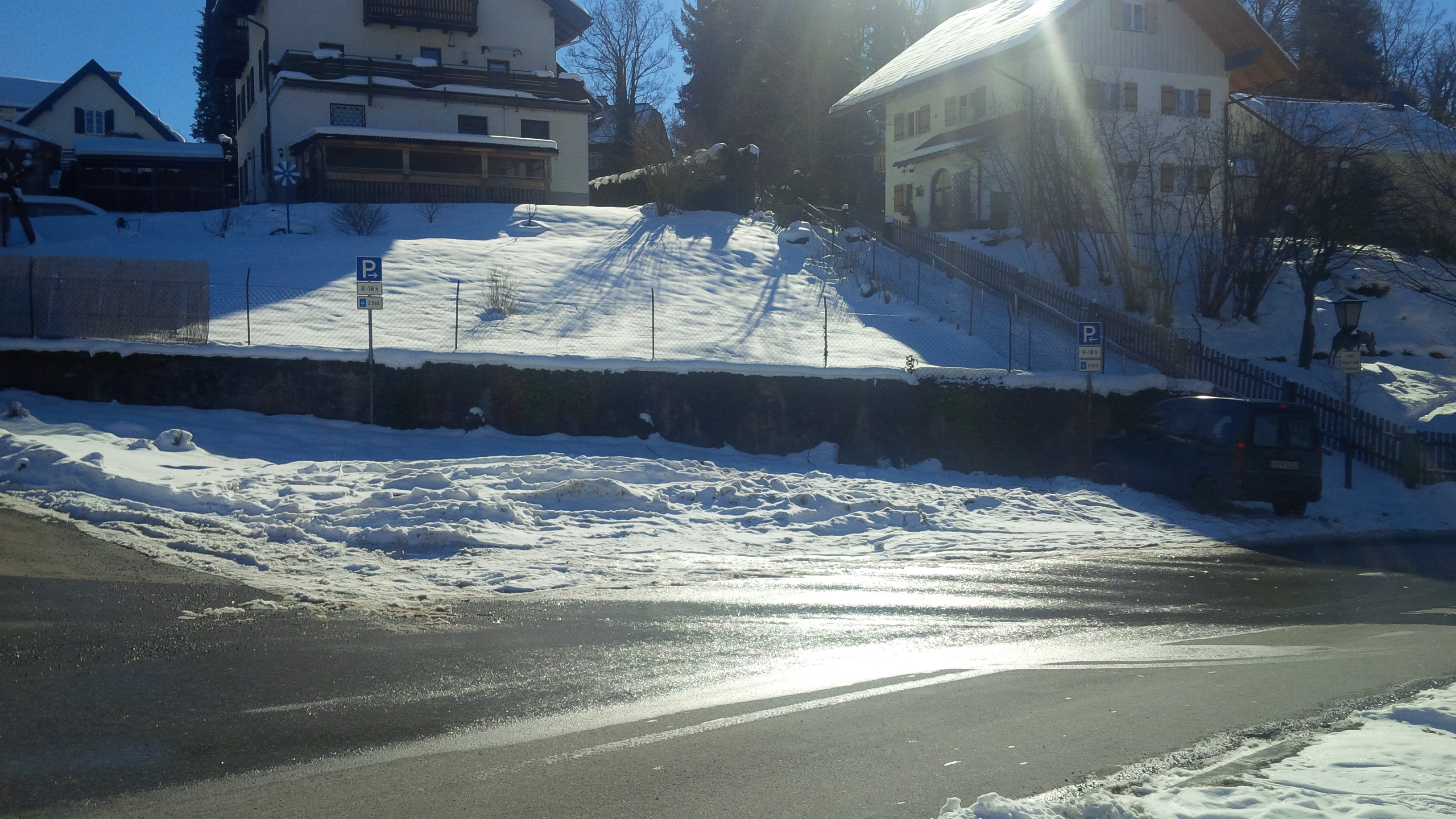 Das ist die Gemeinde Murnau am Staffelsee. Sieht harmlos aus, nicht wahr? Ja, das ist echte Tarnung. Aber fahrt da mal mit eurem PKW drauf. Vor allem rechts, in gerader Linie auf das blaue P-Schild zu. Da kommt Freude auf. Da stand bis vor Kurzem ein Baum. Ein richtig ordentlicher Baum, kein Bäumchen. Den hat man dann umgesägt. Die ganzen Einzelteile des richtig ordentlichen Baumes hat man in den Schnee geschmissen, zwei Tage liegen lassen. Dann hat man sie leidlich ordentlich weggeräumt. Was übrig ist, sind Äste – und nicht zu kleine -, der nicht gekennzeichnete Baumstumpf, ein unordentlicher Schneehaufen, stellenweise gut durchgefrostet, lauter schöne Dinge, bestens geeignet, um am Unterboden eines recht normalen Fahrzeugs (bis hin zu Billig-SUVs) ordentliche Schäden zu hinterlassen.