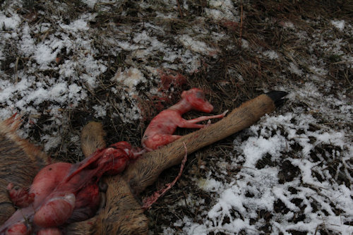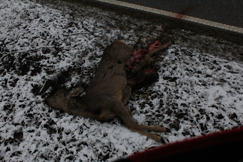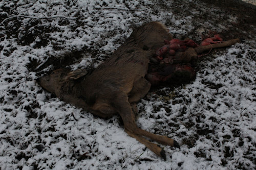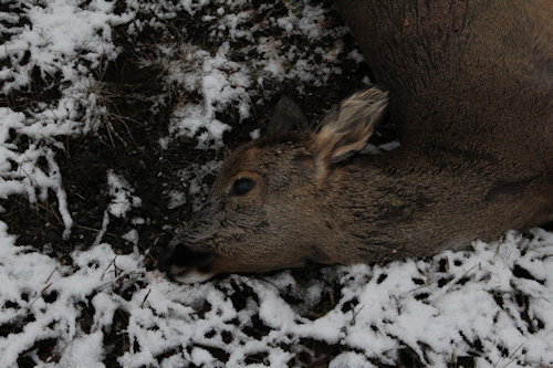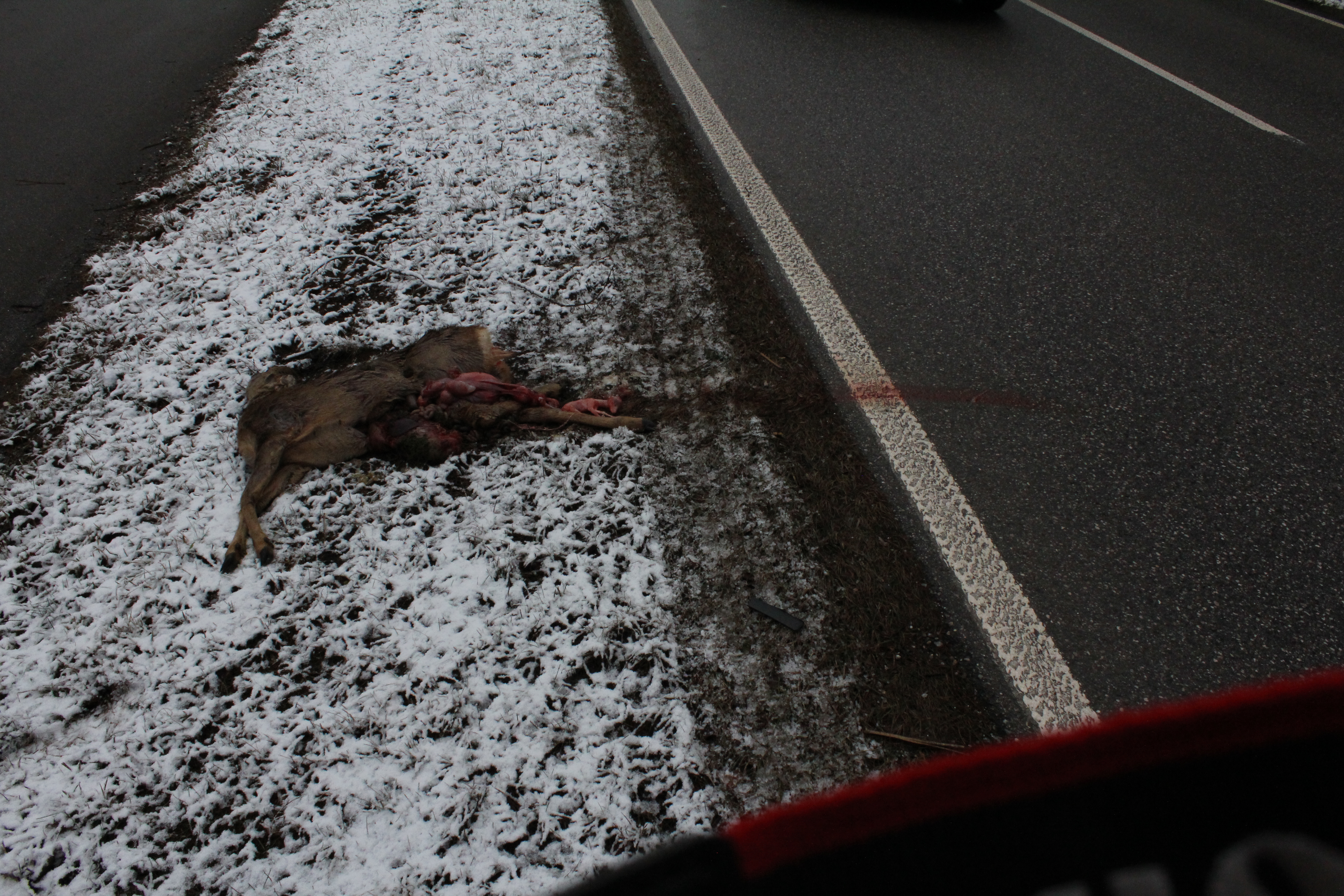 Aber nun gab es einen Toten. Genauer eine Tote. Eine Rehdame, die noch dazu trächtig war. (Empfindsame Gemüter sollten sich diese Bilder ggf. nicht anschauen.)