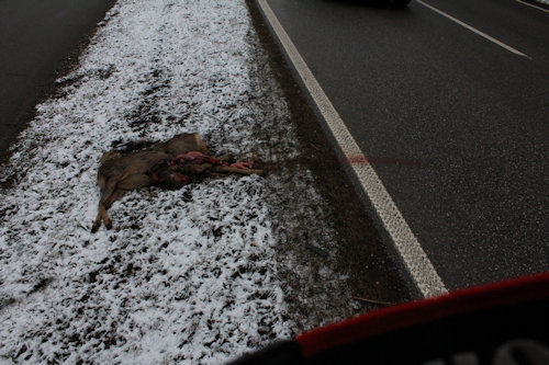 Das Reh kam in der letzten Nacht, vielleicht auch erst im frühmorgendlichen Berufsverkehr – da wird besonders gern auf die Geschwindigkeitsbegrenzung geschissen – ums Leben. Es geschah in der Zone kurz nach der 60-km/h-Begrenzung (keine 20 Meter nach dem Ende der Geschwindigkeitsbegrezung). An der Blutspur konnte man erkennen, dass die Kollision auf der Fahrspur Richtung Murnau geschah, das Tier wurde dann auf die andere Fahrbahnseite und den Randstreifen geschleudert. An dieser Stelle haben die Autofahrer (in Fahrtrichtung Murnau, wie gesagt) die letzten 60er-Schilder und die Geschwindigkeitsanzeige längst vergessen, es werden – nicht nur, aber vor allem nachts – Geschwindigkeiten deutlich über 60 km/h und oft genug auch über 80 km/h gefahren.