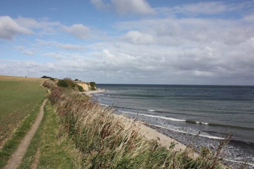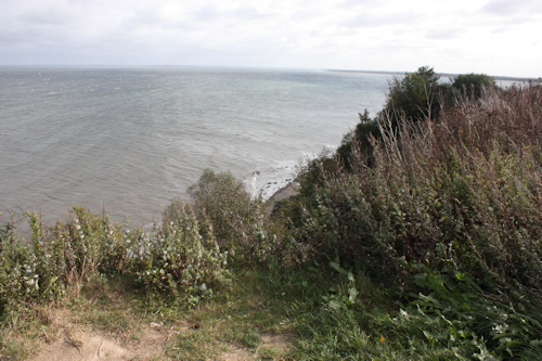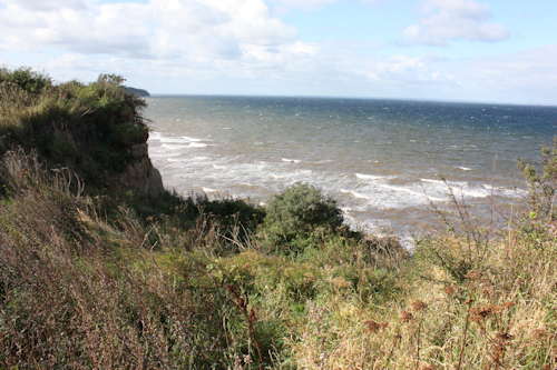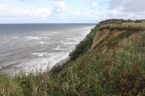 Boltenhagen, noch einmal. Diesmal eine Wanderung von Boltenhagen nach Steinbeck, oben auf der Steilküste, teilweise so an die vierzig Meter über dem Meer gelegen. Wir hatten Glück mit dem Wetter: Es ging zwar ein ordentlicher Wind, aber es gab nur die großen Wolkenschiffe, die schnell über die Himmel zogen, dazwischen immer wieder große Lücken für den Sonnenschein.