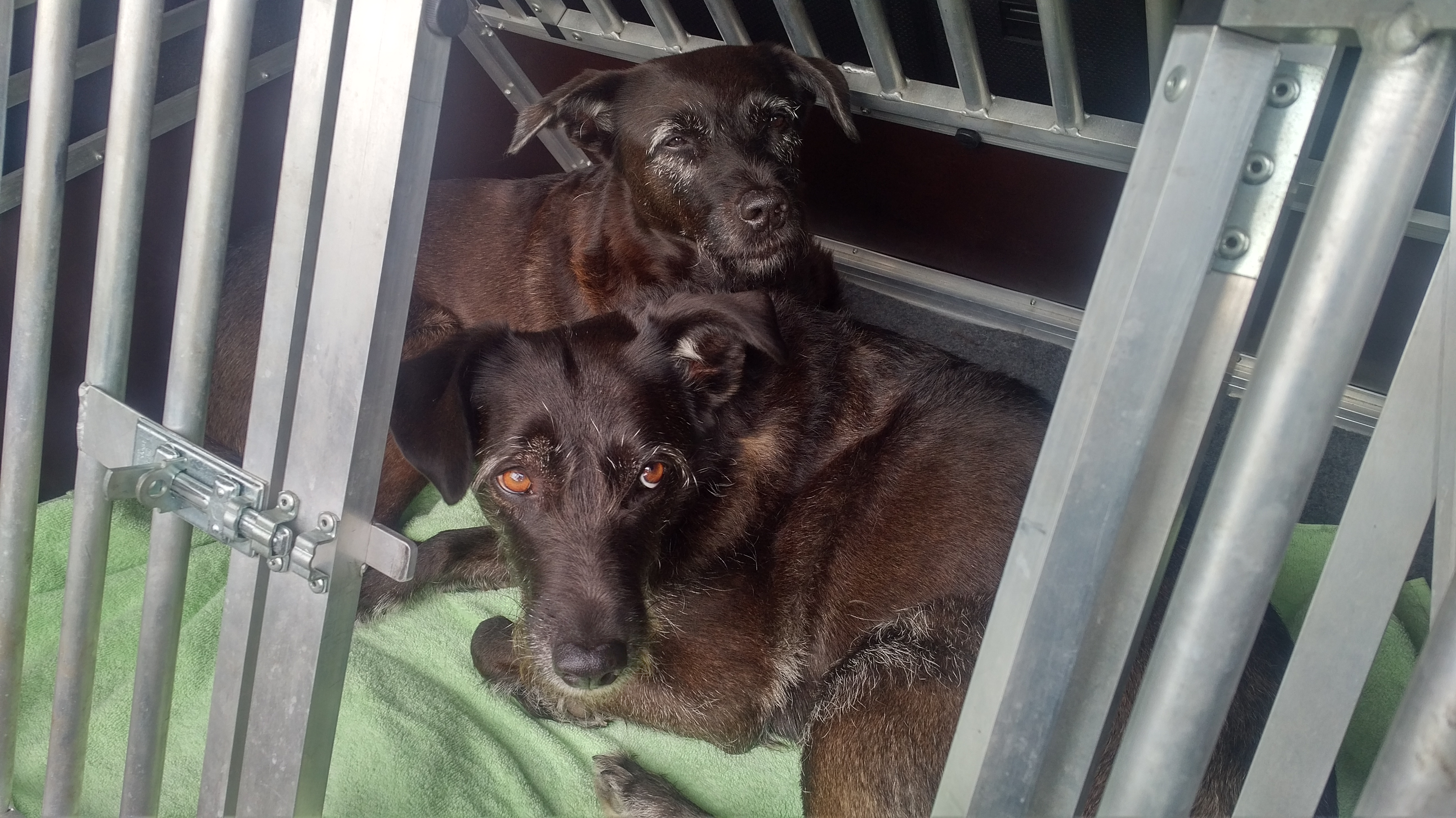 Ursprünglich hatte die Box in der Mitte noch eine Trennwand, die ich jedoch bald entfernte, nachdem sich einerseits zeigte, dass die beiden Hundemädchen halt doch keine Yorkshires sind, und sie andererseits kein Problem damit hatten und haben, sich den am Ende doch begrenzten Raum zu teilen.