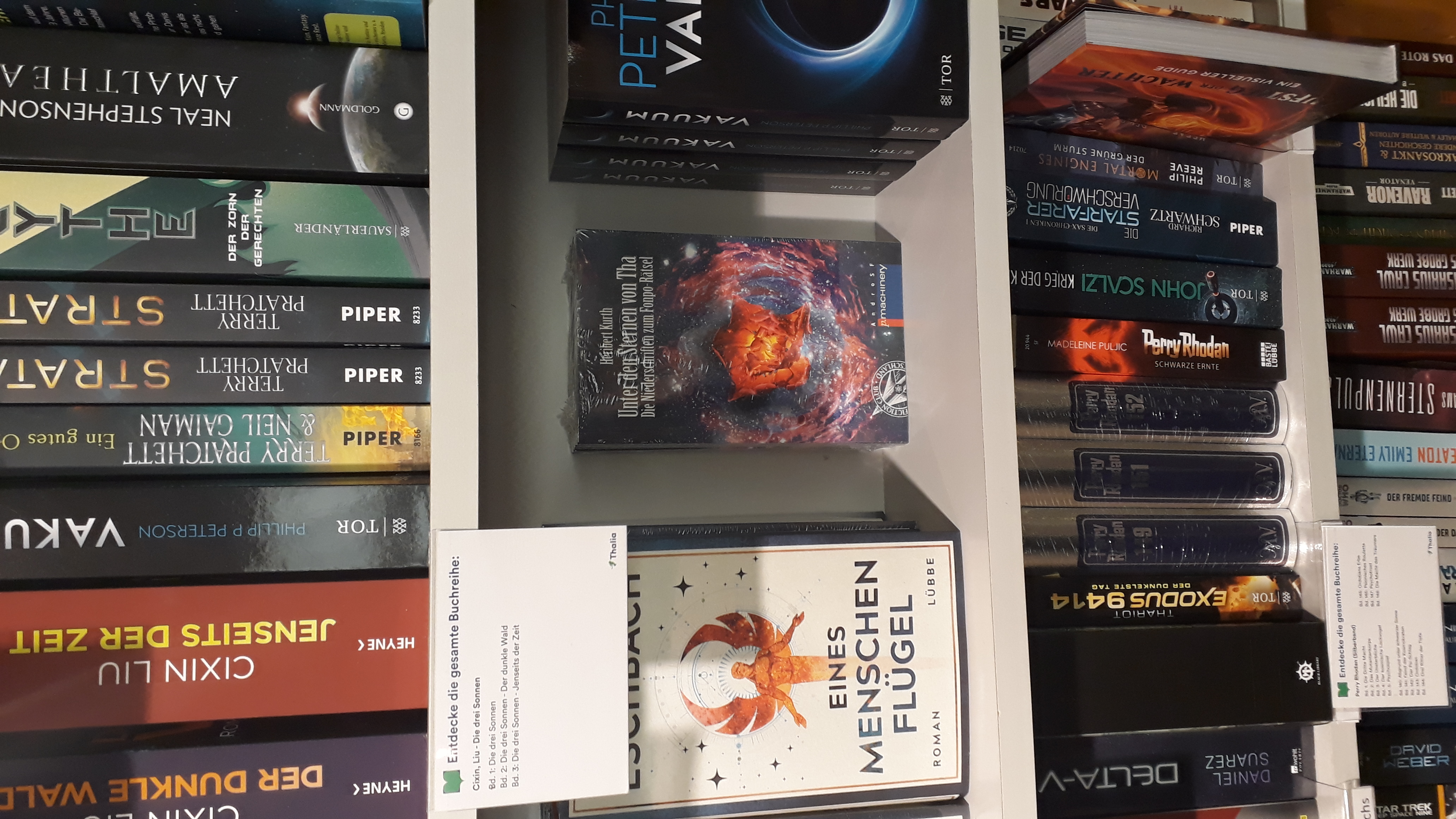 Heribert Kurth ist ganz offensichtlich ein exzellenter Überreder. Thalia in Düren hat sein Buch »Unter den Sternen von Tha« in seinen Regalen platziert. Zwischen Eschbach und Peterson, unter Liu und Pratchett, über Perry Rhodan und Scalzi. Und mein kleiner Verlag zwischen Lübbe, Fischer TOR, Piper, Heyne und Goldmann. Echt nicht übel. Nicht übel. Wirklich nicht übel.