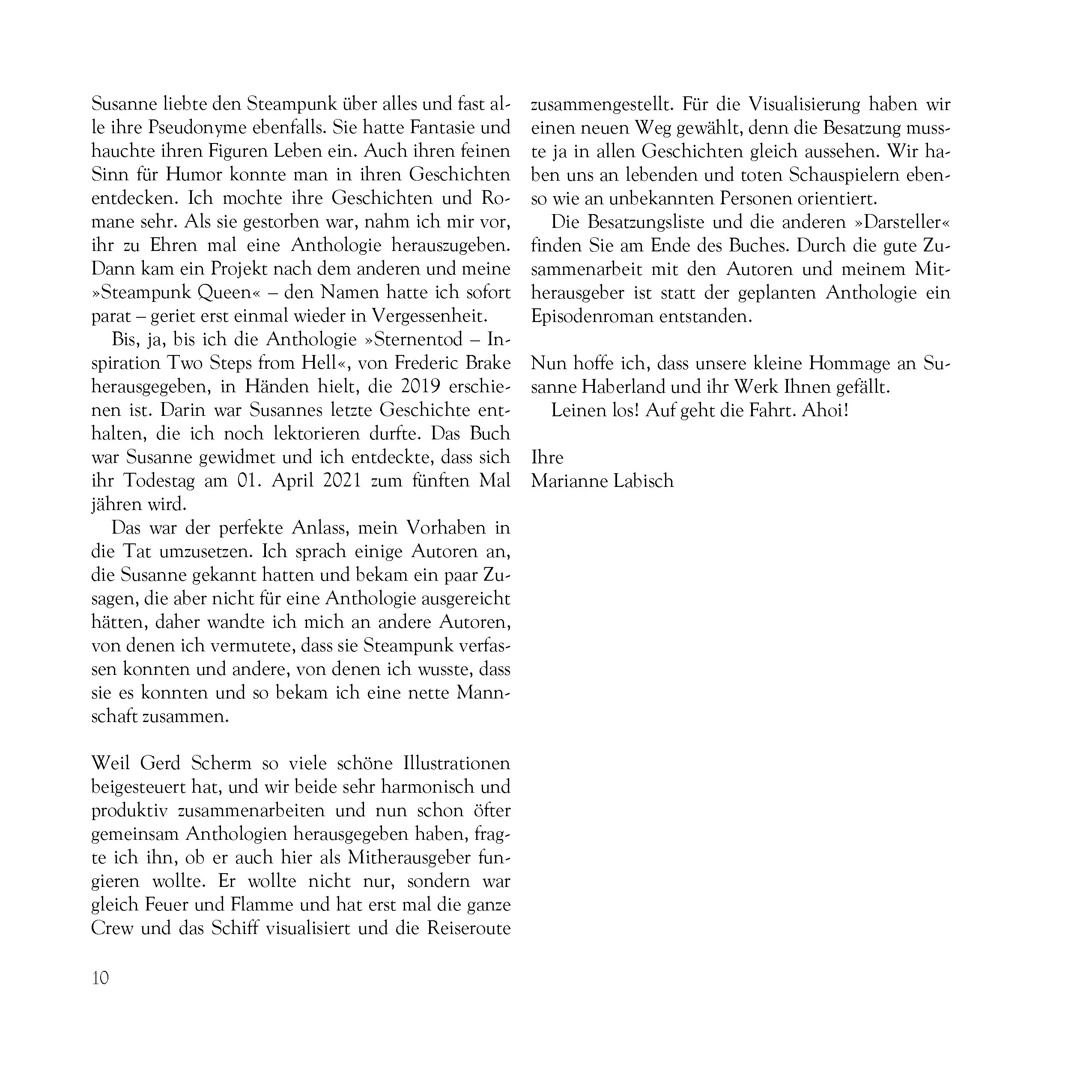 Susanne Haberland war ein liebenswerter Mensch. Ich kannte sie eigentlich nur durch unsere E-Mail-Kommunikation, und selbst da … Wer sie besser kannte, das war Marianne Labisch, und an dieser Stelle erlaube ich mir deshalb, Mariannes Vorwort aus diesem Buch, aus »Die Fahrt der Steampunk Queen« abzubilden:
