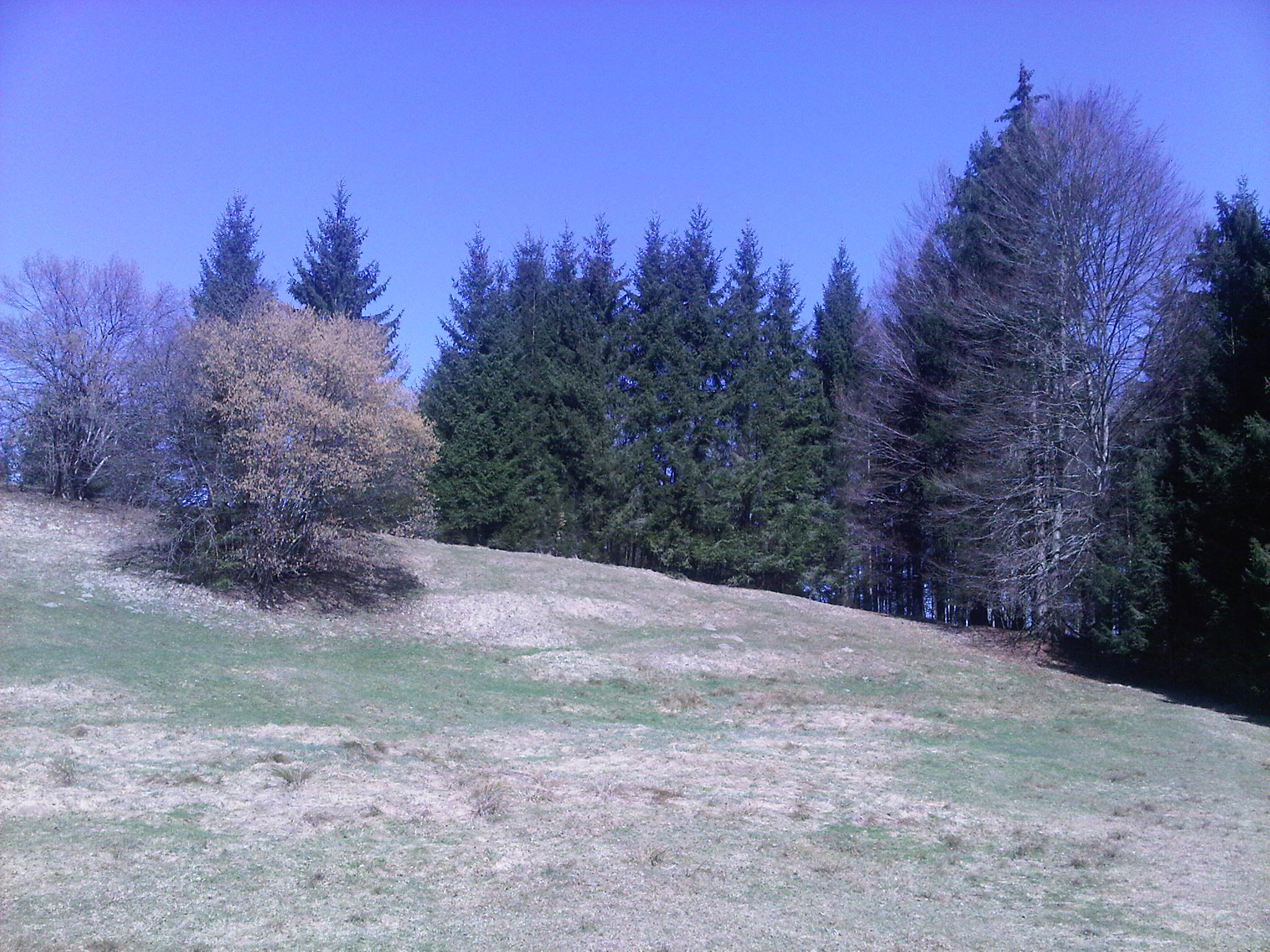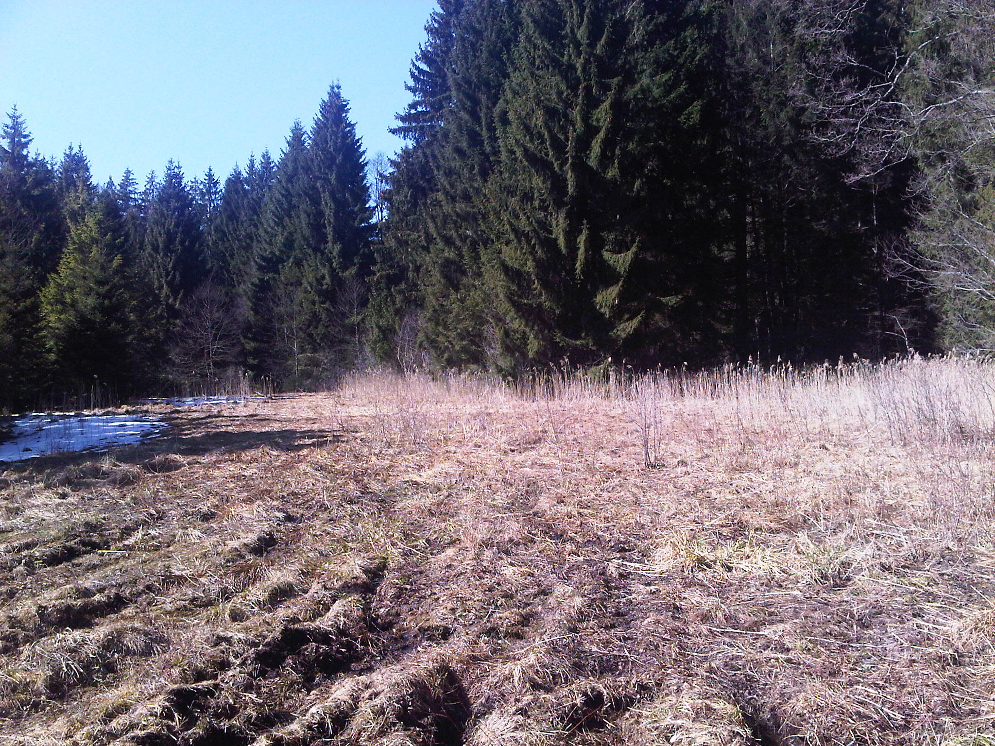 Auf solche Wiesen gelangt man, wenn man Traktorspuren im Wald folgt.