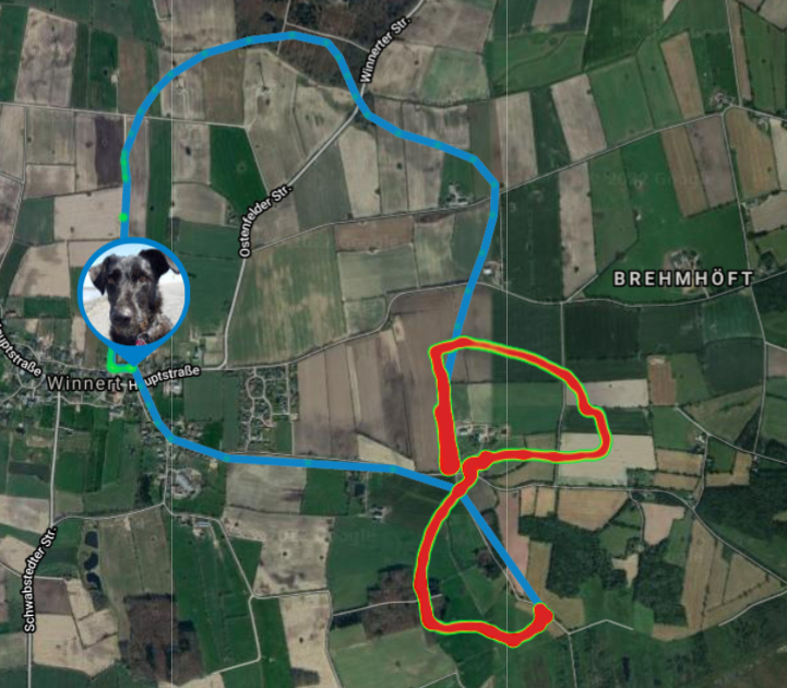Auf dem großen Bogen im Norden der Runde lief Naomis Tracker im Normalbetrieb; der rot markierte Teil war dann »live« – da kann man dann die Bewegungen des Hundes quasi 1:1 verfolgen. Am südlichen Ende der roten Linie hatten wir die beiden Hunde dann eingefangen.