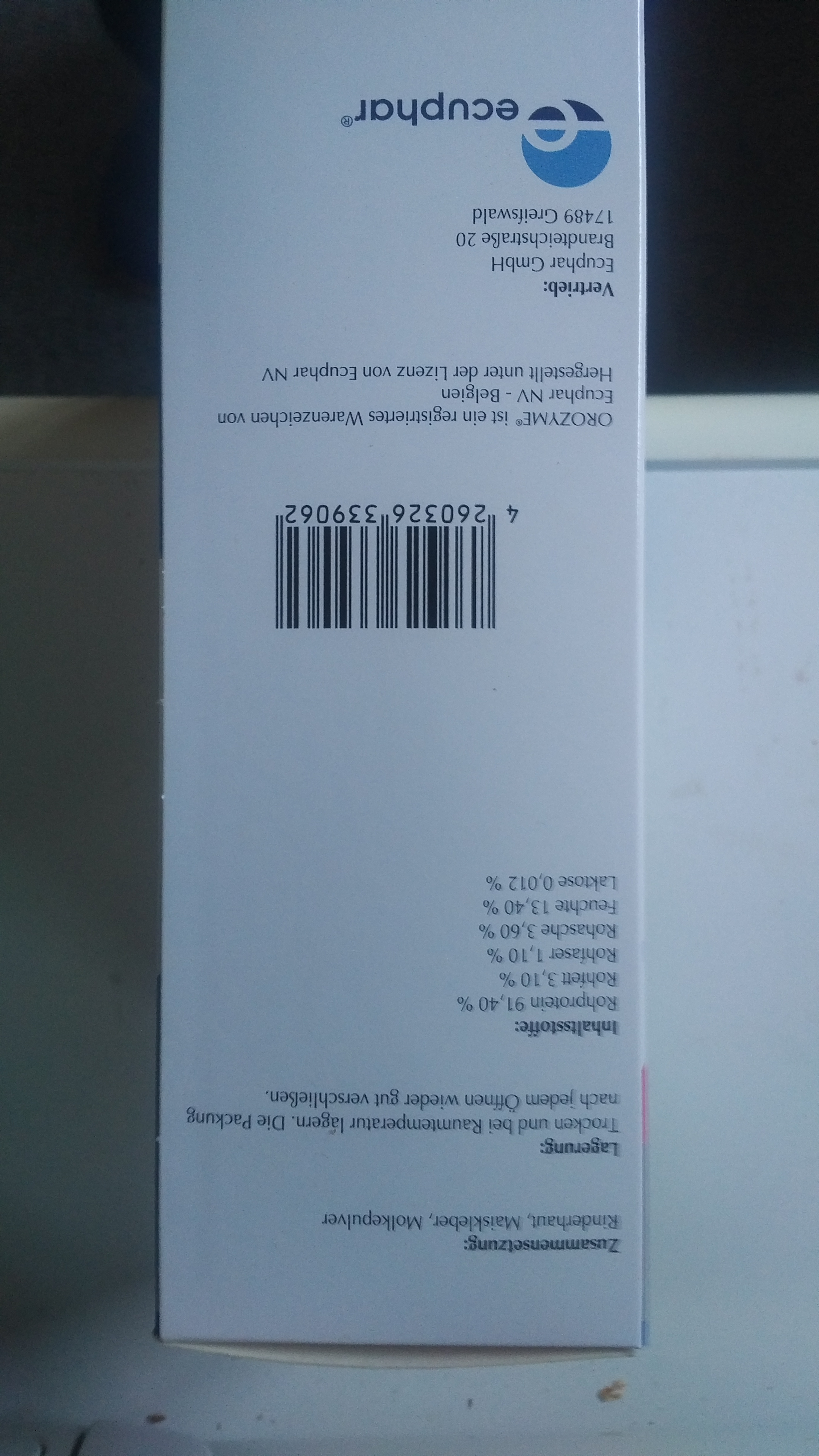 OROZYME ist ein Warenzeichen der belgischen Firma Ecuphar, die den Vertrieb einem deutschen Ableger in Greifswald übertragen hat. Hergestellt wird das Produkt in Mexiko, wobei die Herstellerangabe auf der Verpackung irreführend ist: